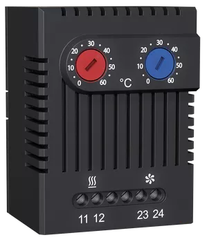1. Двухполюсный зажим – подключение вентилятора/нагревателя. 2. Крепление на DIN-рейку. 3. Поворотная шкала для задания уставки. | 1. Поворотная шкала задания уставки для нагревателя. 2. Поворотная шкала задания уставки для вентилятора. 3. Четырехполюсный зажим – подключение нагревателя и вентилятора. |